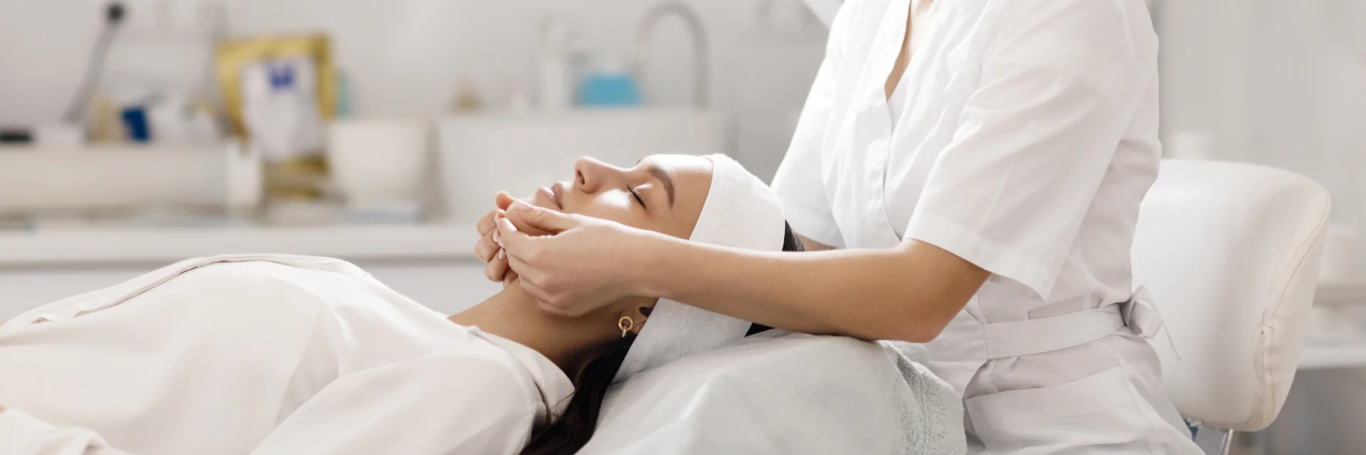 Lors d’un RDV bilan visage par VISIA 7, l’assistante de votre médecin esthétique commence par démaquiller la patiente, puis installe le visage sur un socle fixe face caméras.